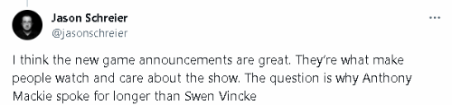 知名记者Jason Schreier发文称今年TGA典礼过于重视宣传,且忽视了颁奖过程。