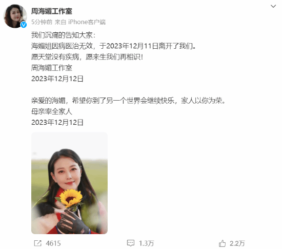 周海媚工作室官方发布消息:海媚姐因病医治无效,于2023年12月11日离开了我们。