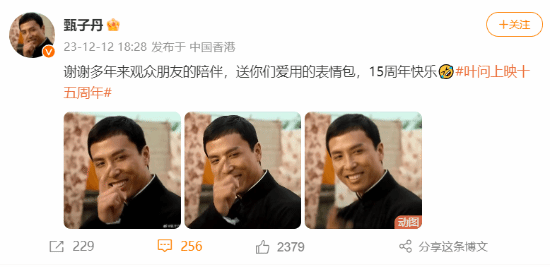 《叶问》上映十五周年之际,甄子丹在微博上分享了自己的表情包,并将其换成了自己的头像:“谢谢多年来观众朋友的陪伴,送你们爱用的表情包,15周年快乐”。