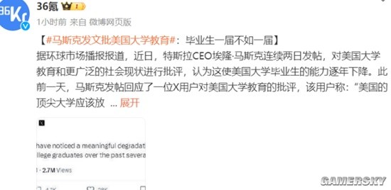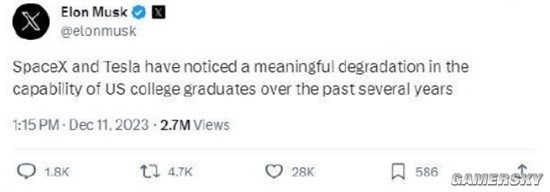 马斯克回应称:“SpaceX和特斯拉注意到,过去几年美国大学毕业生的能力明显下降。”加拿大康考迪亚大学教授加德·萨阿德(Gad Saad)在马斯克的帖子下评论称:“作为一个做了30年教授的人,我同意埃隆·马斯克的观点。马斯克回应了萨阿德的帖子,称 “顺境使人软弱。”