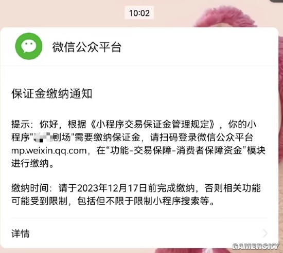 通知称,根据《小程序交易保证金管理规定》,你的小程序“XX剧场”需要缴纳保证金。微信公众平台提醒,需在2023年12月17日前完成缴纳,否则相关功能可能收到限制,包括但不限于限制小程序搜索等。