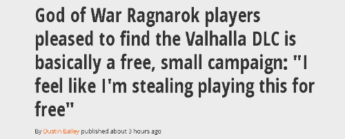 据外媒gamesradar消息,《战神:诸神黄昏》的「英灵殿」免费DLC上线后获得了粉丝们的普遍好评,不少玩家表示作为一款免费内容,其内容非常丰富并有不少“惊喜”,甚至有人直言免费游玩这个DLC给人一种“像是在偷东西”的感觉。