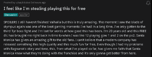 一位玩家在Reddit论坛发文表示:“英灵殿DLC令人惊叹,尤其是当我再次看到奥林匹斯之剑的那一刻。这款免费DLC让我仿佛回到了12岁在PS2上玩初代战神的日子。开发商圣莫尼卡给老粉丝们送上了一份令人惊喜的礼物,我真不敢相信,一家现代公司能免费推出如此高品质且有趣的游戏。”另一位玩家则表示开发商完全可以为此收取20-30美元,因为其中有丰富的内容、大量战斗和调整,这太良心了。