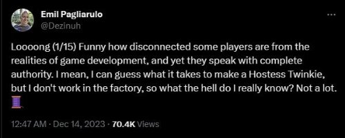 “有趣的是,一些玩家与游戏开发的现实脱节,但他们的言论却表现得非常权威。‘我能猜出制作Hostess Twinkie(一个美国甜点品牌)需要什么,但我不在工厂工作’,所以到底知道些什么?其实并不多。