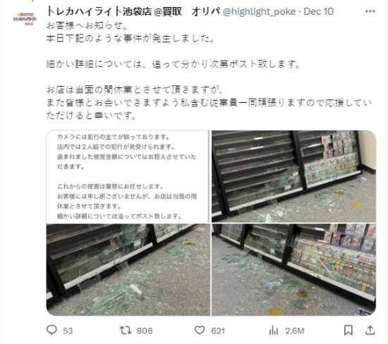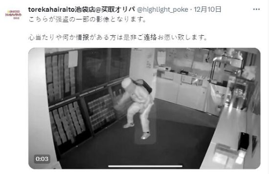 据日媒《冲绳Times》报道,12月10日深夜2点,一家位于池袋的集换卡交易商店发生了一起强盗入室抢劫案。