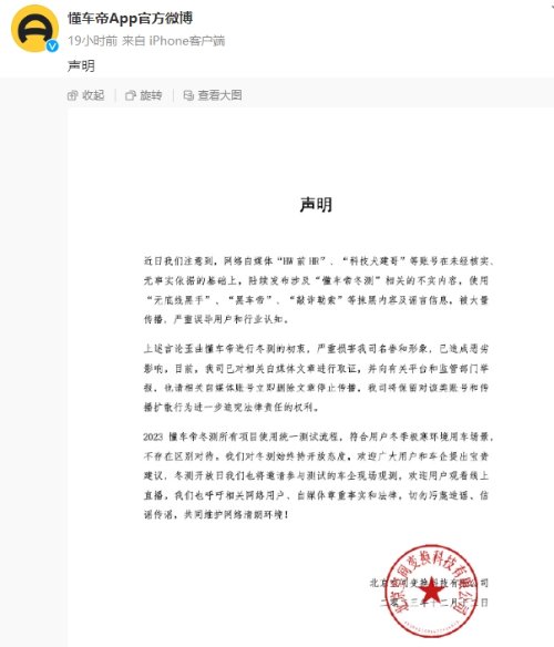 针对外界的质疑,懂车帝官方给出声明称已对抹黑冬测言论取证,将保留追责权利,而随后这条官微也是沦陷。