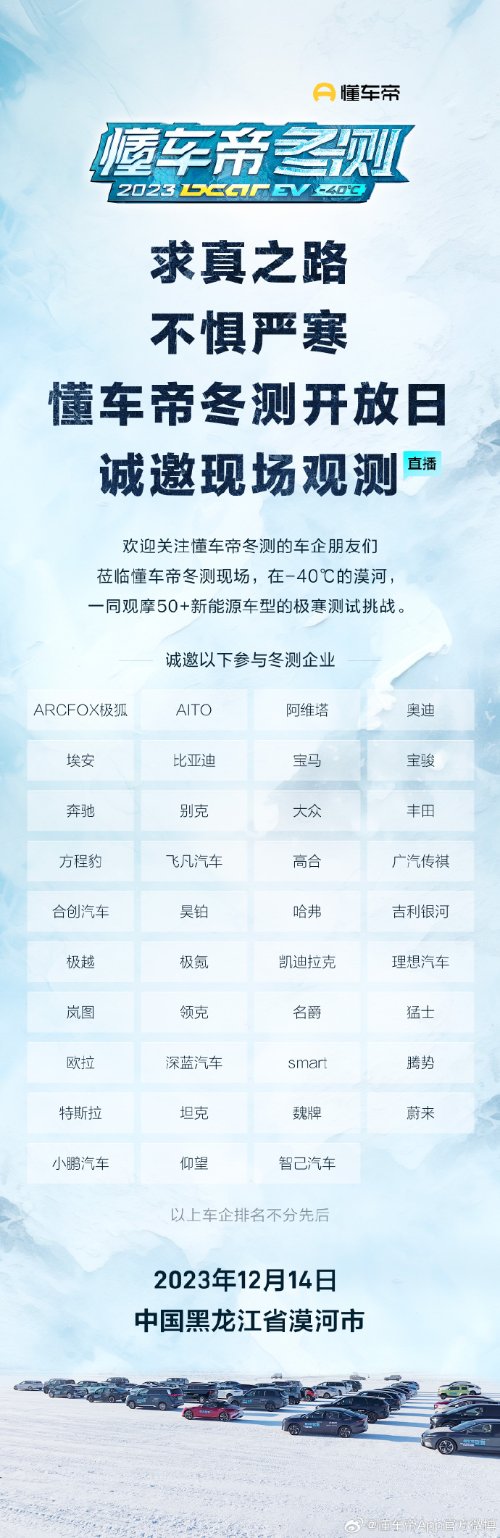当然评论区也是呈现了两极分化,一部分网友表示,这就是自己定规则自己测试游戏,不用太当真,也有网友表示,还是愿意相信懂车帝的真实测评。对于这些说法,懂车帝再次表示,我们冬测正在进行中,12月14日上午9点,懂车帝将在漠河举行2023冬测开放日,诚邀所有参与车企现场观测,将全程直播。
