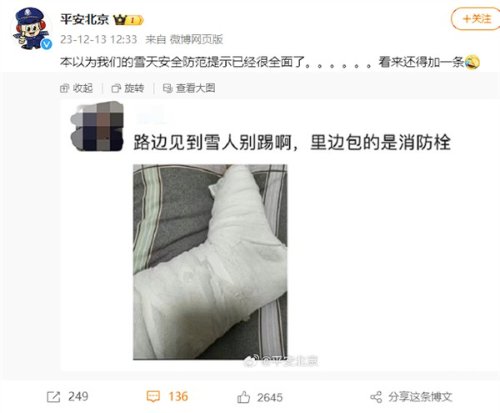 12月13日,平安北京官方发布微博提醒称:本以为我们的雪天安全防范提示已经很全面了,看来还得加一条。而配图更为有趣,是张缠满绷带的脚,并配有文字“路边见到雪人别踢啊,里边包的是消防栓”。