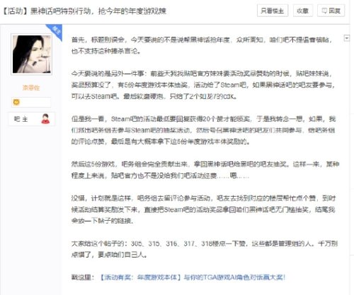 据悉,由于今年没有分到奖品预算,洛恩佐带领吧务组去参与分到奖品指标的Steam吧的抽奖活动,凭着人多靠最多的回复数包揽头奖:《博德之门3》5份,然后拿回自己的吧内无缝重抽,抽奖条件为对应帖子内回复“我永远喜欢Steam吧”。