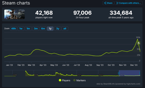 这波操作直接让这部18年发售的《怪物猎人:世界》的在线人数打破了三年来的记录,达到2020年10月以来的最高24小时在线人数的峰值。