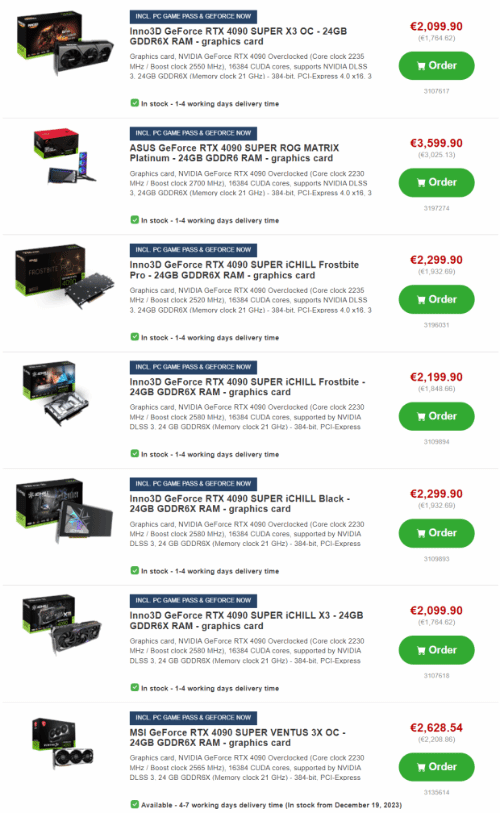tweaktown消息,欧洲零售商Proshop在其网站上列出了24款不同的NVIDIA GeForce RTX 4090 SUPER显卡,每款显卡都使用了RTX 4090的图片,且最高售价为3599.9欧元,这很可能是一个操作失误。
