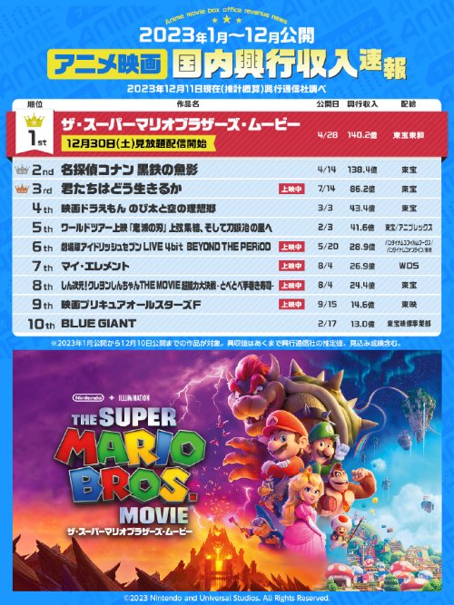 根据亚马逊Prime Video Anime官方统计数据,《超级马力欧兄弟大电影》以140.2亿日元的成绩,成为2023年日本票房收入最高的电影,第二名为《名侦探柯南:黑体的鱼影》。
