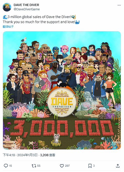近日大火的独立游戏《潜水员戴夫》销量突破300万!游戏自2023年6月28日上线,目前游戏在steam评分好评如潮,好评率为97%。