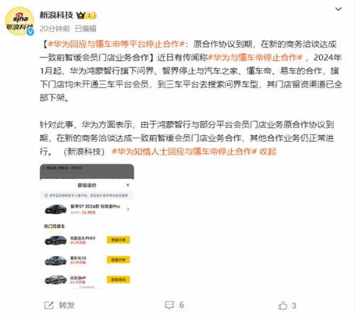 昨日晚间到今天,一条“华为停止与懂车帝合作”的消息登上各大平台热搜。