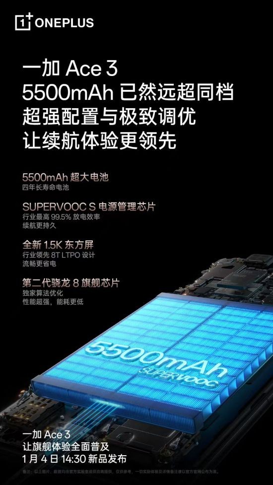 1 月 3 日,一加宣布一加 Ace 3 搭载 5500mAh 电池,配备 SUPERVOOC S 电源管理芯片,在全新 1.5K 东方屏与第二代骁龙 8 旗舰芯片加持下,续航体验领先同档。