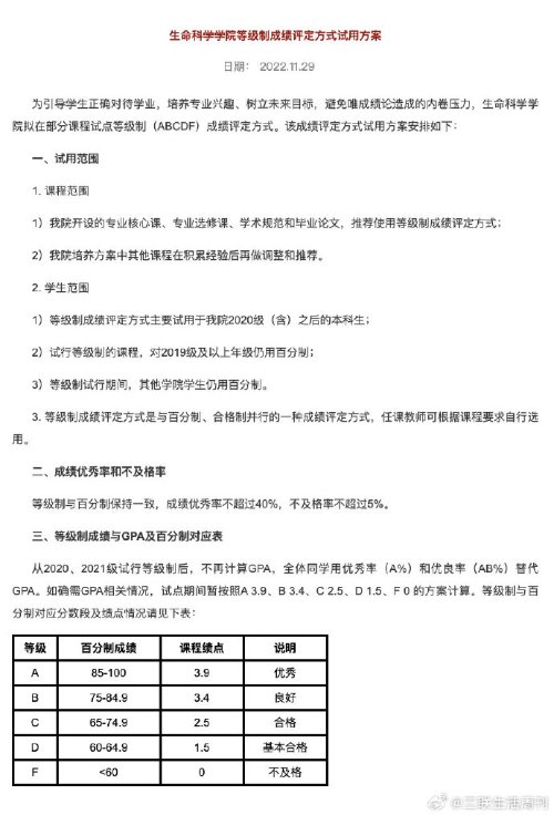 据了解,开展试点改革的是北大生命科学学院,从2020级开始,该学院在开设的专业核心课、专业选修课、实验和实践类课程的成绩评定中推荐采用等级制。