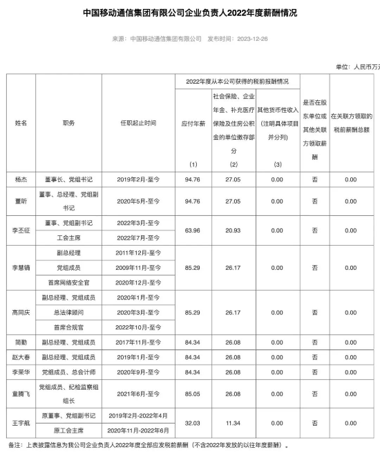 中国移动年薪最高的是董事长、党组书记杨杰,时任总经理、董事、党组副书记董昕,均为94.76万元。