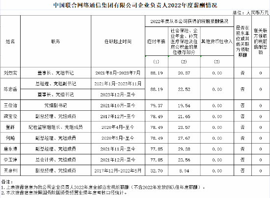 中国联通年薪最高的是时任董事长、党组书记刘烈宏,现任董事长、党组书记陈忠岳,均为88.19万元。