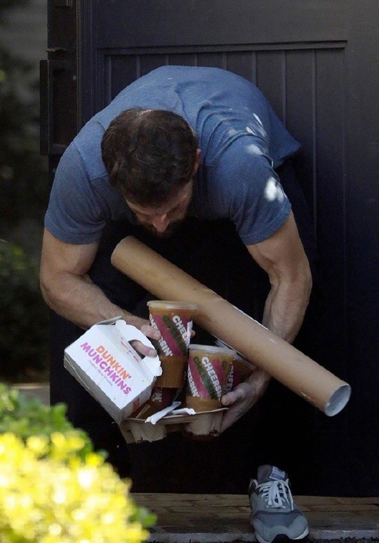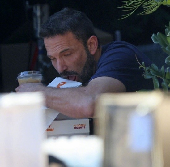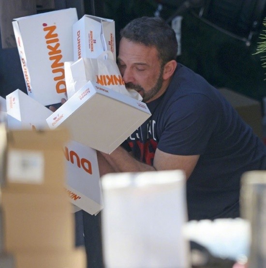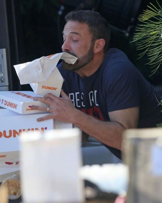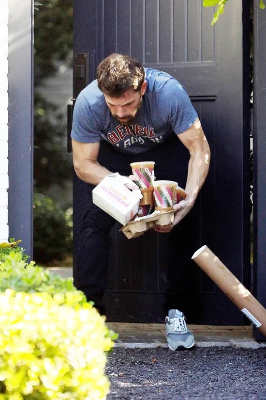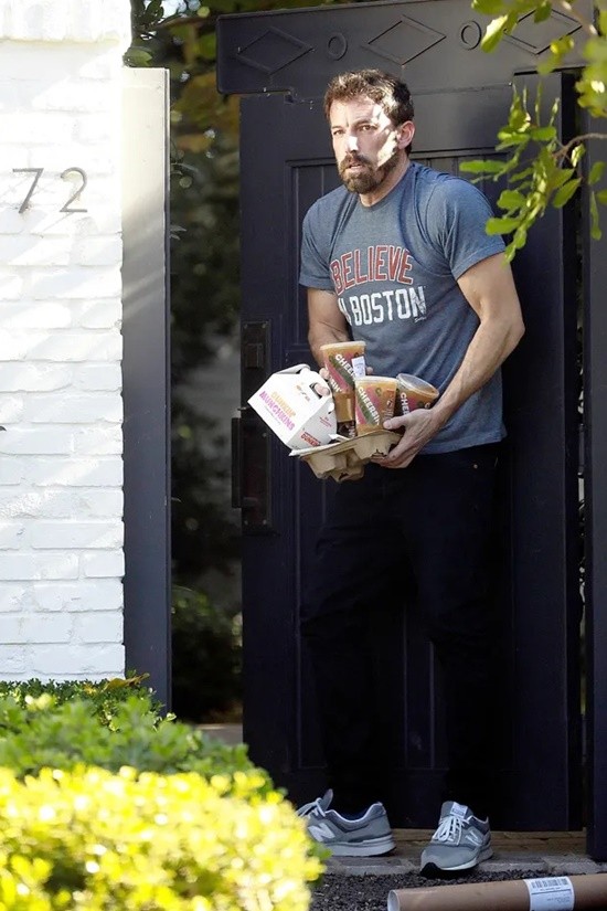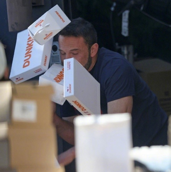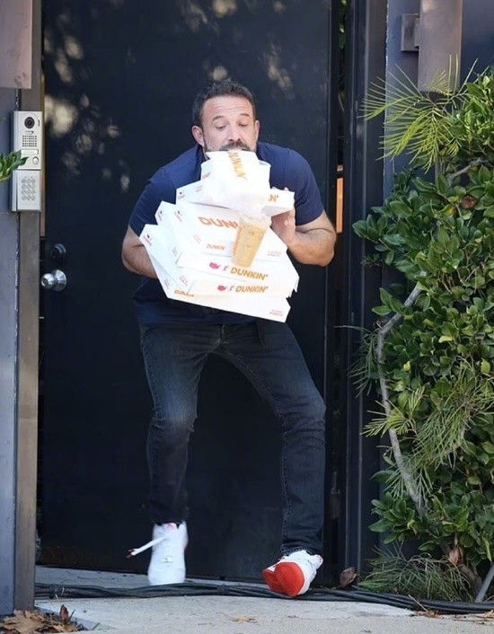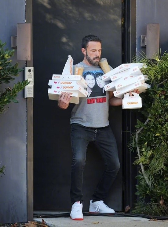 据守望好莱坞报道,本·阿弗莱克穿着有马特·达蒙头像的T恤拍摄甜甜圈广告。在现场拍摄之余他还复刻2020年“大本”取外卖结果甜甜圈咖啡掉地上了名场面,一位很有故事感的男人。