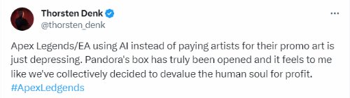 国外一位名为Thorsten Denk的设计师发文称:“开发团队和EA的做法令人沮丧,他们使用了人工智能而不是雇用艺术家,为了利润而放弃人类艺术的灵魂。”