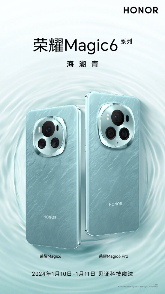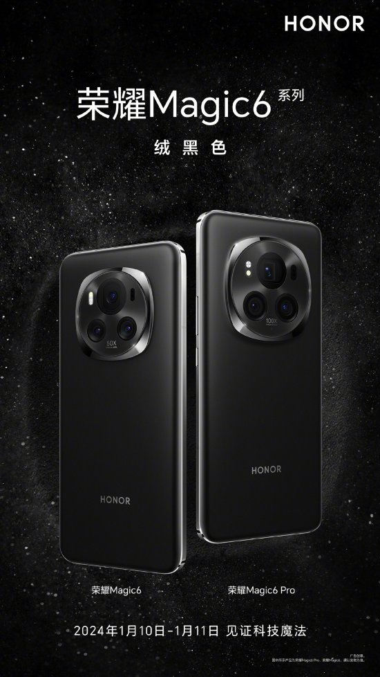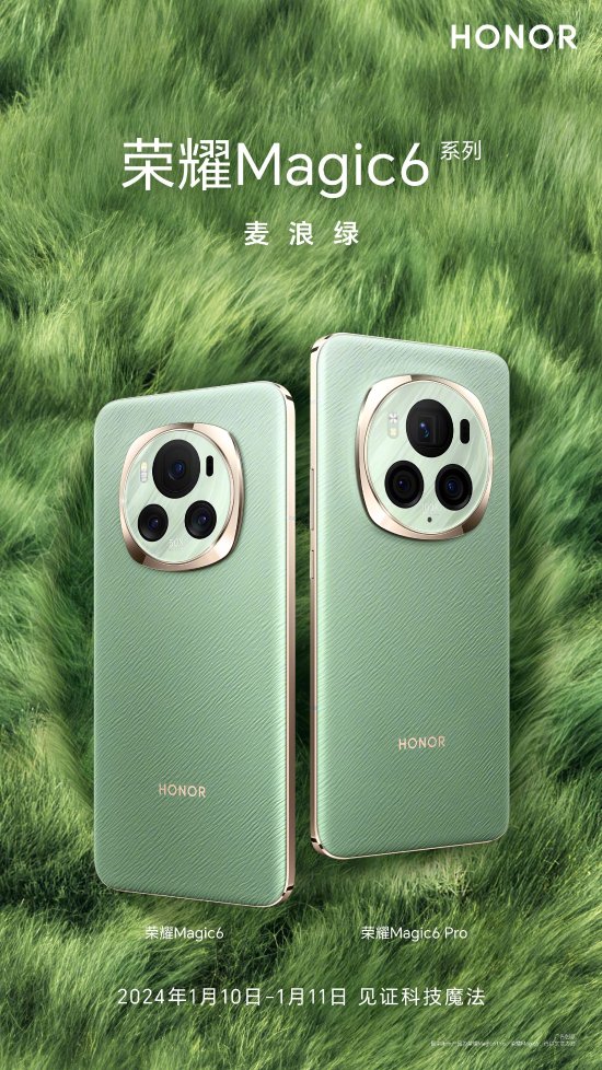 荣耀 Magic6 系列公开了最后一款配色“绒黑色”,目前,标准版与 Pro 版的五款配色:海湖青、流云紫、祁连雪、麦浪绿、绒黑色已全部登场。