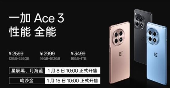 一加持续秉持「产品力优先」理念,让旗舰性能的全面普及,既有强大的产品力,也有极具诚意的价格。一加 Ace 3 星辰黑和月海蓝配色将于 1 月 8 日 10:00 正式开售,鸣沙金配色将于 1 月 15 日 10:00 正式开售,12GB 256GB版本售价 2599元,16GB 512GB版本售价 2999 元,16GB 1TB版本售价 3499元。