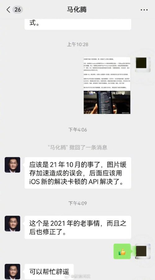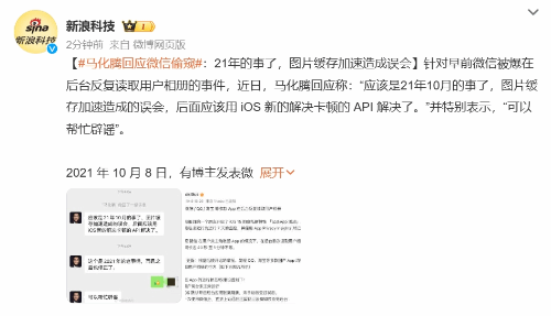 新浪科技消息,针对早前微信被爆在后台反复读取用户相册的事件,近日,马化腾回应称:“应该是21年10月的事了,图片缓存加速造成的误会,后面应该用 iOS 新的解决卡顿的 API 解决了。”并特别表示,“可以帮忙辟谣”。
