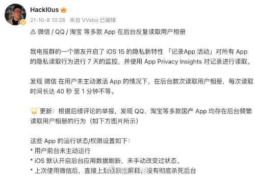2021 年 10 月 8 日,有博主发表微博称,包括微信等在内的多款国民级 App 在后台反复读取用户相册。当时,iOS 15 上新隐私特性"记录App活动“,前述博主在对所有 App 的隐私读取行为进行了7天的监控后发现,微信在用户未主动激活 App的情况下,在后台数次读取用户相册,每次读取时间长达40秒至1分钟不等。