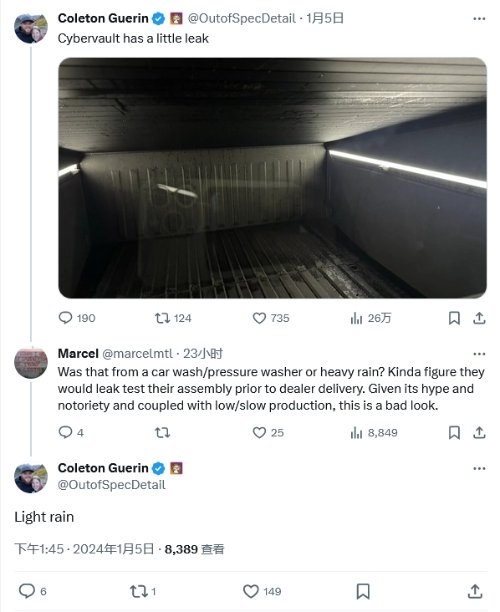 @OutOfSpecDetail 近日发布推文,表示特斯拉Cybertruck的车斗即便是完全拉下盖子,在下小雨的情况下,依然有进水的情况发生。