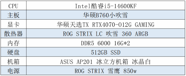 首先为偏爱浅色主题主机的玩家推荐一套颜值实力俱佳的酷睿14代白色主题平台。以华硕B760小吹雪主板为核心,搭配Intel酷睿i5-14600KF处理器、华硕DUAL-RTX4070-O12G-WHITE显卡等硬件,以及其他ROG桌搭设备组建而成,不仅拥有出众的颜值,性能更是无比强悍,可高画质流畅运行各类3A大作,为玩家带来无与伦比的游戏体验。