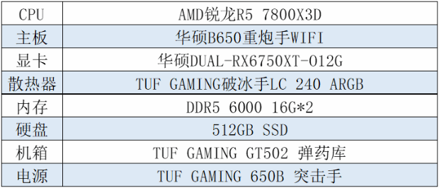 如果你更偏爱深色主机,又恰好是AMD粉丝,那么千万不要错过下面这套硬核黑武士风格的电竞平台。其以华硕B650重炮手WIFI主板为核心,搭配锐龙R7 7800X3D处理器、华硕TUF-RX6700XT-O12G-GAMING显卡等硬件的AMD锐龙超燃主机。其作战性能同样强悍,可为玩家带来畅爽游戏体验。