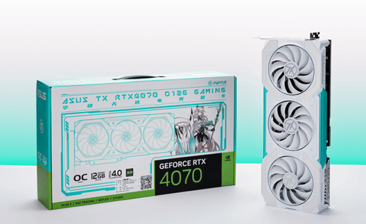 显卡推荐华硕天选TX GAMING GeForce RTX4070-O12G,依旧采用了家族式的设计风格,将二次元风格可谓是玩出了新高度,整个显卡的外观设计给人一种简约干净、清新优雅的气质,在一众游戏显卡中有着相当鲜明的辨识度。显卡散热依旧配置了三把轴流风扇,金属背板搭配魔幻青线条装饰,绝对是颜值担当。