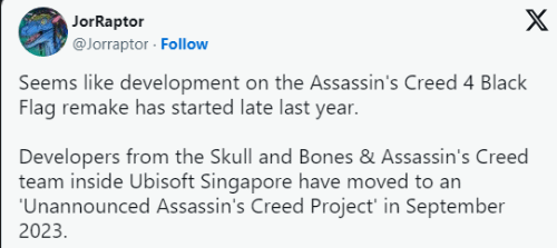 媒体透露,负责该项目的团队是育碧新加坡,其首席艺术家的资料显示,早在2023年九月份《刺客信条4:黑旗》重制版就已获得批准并开始制作了。