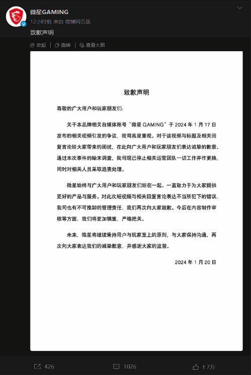 今日,微星发布致歉声明,就此前不久引起广大网友热议的“删男友游戏”的有关言论向玩家致歉,但似乎并没得到所有玩家的认可。多条热评言论吐槽,这篇声明连个公章都没有盖,并且连署名也没有。还由玩家开玩笑道,声明发布的时间太迟了,“游戏都被删完了 变前女友了 你才道歉”。