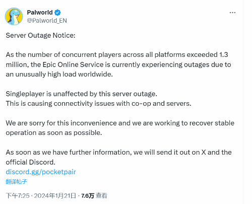 而同时,《幻兽帕鲁》官方也在推特发布声明,称由于游戏的全平台同时在线玩家数量超过 130 万,Epic 在线服务目前因全球负载异常高而出现中断情况,这会导致玩家的联机出现问题。