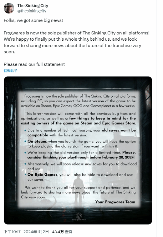 而在1月16日,《沉没之城》已经在Steam、GOG和Gamesplanet上线,并将很快登陆Epic。