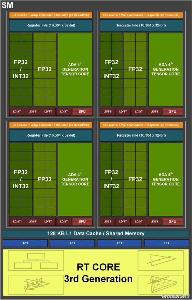 按照Ada Lovelace架构的每个SM流式多处理器里包含了64个FP32单元和64个FP32/INT32混合单元,可视作为128个FP32单元,因而每个SM内为128个CUDA;按照每个SM配置了4个纹理单元、1个RT单元、4个Tensor core来计算,RTX 4070 SUPER一共拥有28组TPC、56个SM簇,共计7168个流处理器单元,224个纹理单元,56个三代RT单元和224个Tensor core。