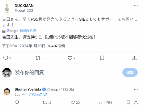 当评论区有玩家询问该作品是否会登录PS平台时,吉田也是表达了正面积极的态度,虽然只有简简单单一个“好”字,但几乎也是在明示《幻兽帕鲁》会在日后登录PS平台了。