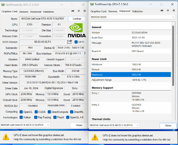 GPU-Z检测下的微星RTX 4070 Ti SUPER GAMING SLIM参数信息