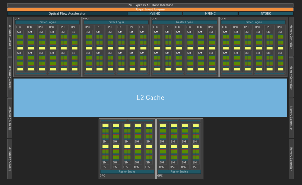 与完整AD103核心相比,RTX 4070 Ti SUPER使用的AD103-275阉割了1个完整GPC和其中1个GPC中的1个TPC,即AD103-275由6个GPC构成,其中4个GPC包含6个TPC,1个GPC包含5个TPC,1个GPC包含4个TPC,每个TPC拥有两组SM,共计为66组SM,即8448个CUDA。