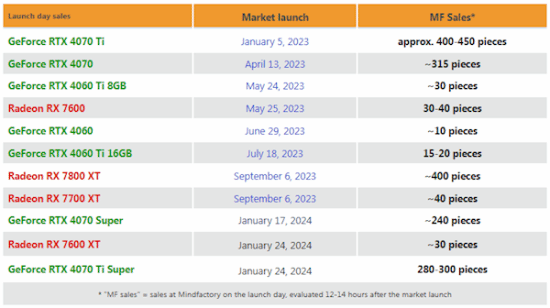 3DCenter的初步统计显示,RTX 4070 Ti SUPER在德国首销当天卖了280-300块,RX 7600 XT则只卖了30块左右,前者是后者的至少9倍,甚至可能是10倍。