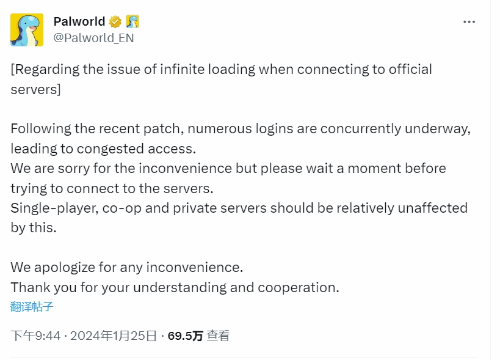 《幻兽帕鲁》官方发文确认,在本周早些时候发布了游戏补丁之后,一些玩家可能会遇到服务器无法访问的问题。