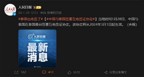 据央视新闻报道,当地时间1月28日,在泰国曼谷,中国与泰国在泰国曼谷签署互免签证协定。该协定将从2024年3月1日起生效。