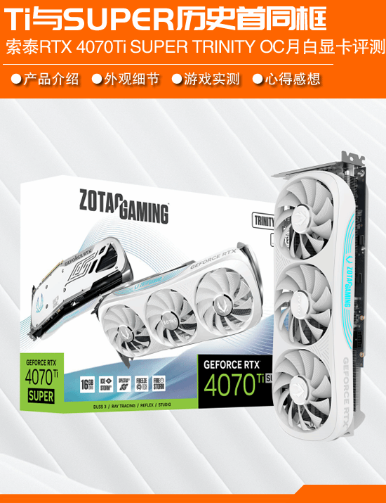 本次我们为大家带来的是索泰RTX 4070 Ti SUPER TRINITY OC月白显卡的性能测试,来看看RTX 4070 Ti SUPER在实际游戏与内容创作方面能有多少提升,以及这款索泰RTX 4070 Ti SUPER TRINITY OC月白在外观、做工、散热等方面的表现如何。