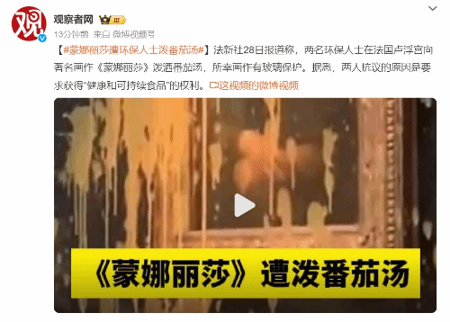 观察者网报道,法新社28日报道称,两名环保人士在法国卢浮宫向著名画作《蒙娜丽莎》泼洒番茄汤,所幸画作有玻璃保护。据悉,两人抗议的原因是要求获得“健康和可持续食品”的权利。