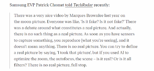 三星执行副总裁Patrick Chomet表示:“一段关于灯光变成月球的图片传播很广。大家都说这是假的,关于什么构成真实图片存在争议。事实上,不存在真实的图片这样的东西。一旦你用传感器来捕捉某些东西,你就会重现[你所看到的],但这没有任何意义。你可以尝试通过说“我拍了那张照片”来定义真实的照片,但如果你使用人工智能来优化变焦、自动对焦和场景——它是真实的吗?还是全都是滤镜?”