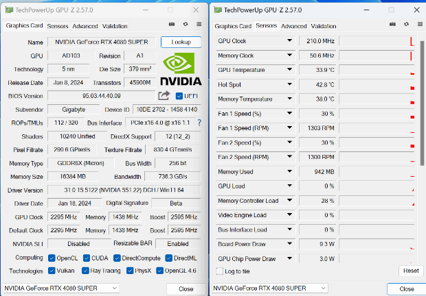 GPU-Z检测下的技嘉RTX 4080 SUPER GAMING OC 魔鹰 16G参数信息