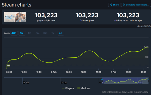 据Steamdb数据显示,由Cygames开发的ARPG新作《碧蓝幻想:Relink》Steam同时在线人数已突破十万人,此数字仍有继续上涨的趋势。