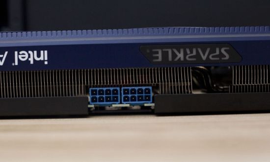 在显卡的供电接口方面,Sparkle(撼与科技)Intel Arc A770 TITAN 16GD6给到了两个8pin的接口,这里两个接口同样是蓝色的设计,与显卡整体配色保持一致,带动225W的功耗是完全没问题的。