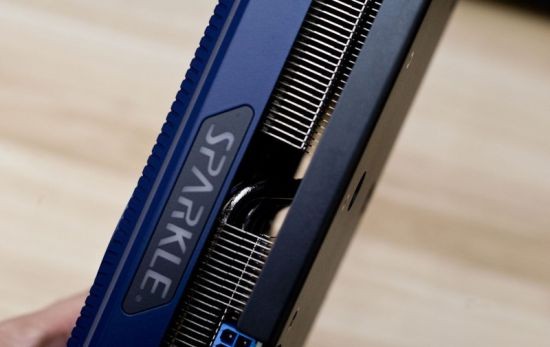 透过显卡的侧面可以看到,Sparkle(撼与科技)Intel Arc A770 TITAN 16GD6的TORN散热系统搭载了大尺寸的散热片以及镀镍的热管,散热方面还是很给力的。